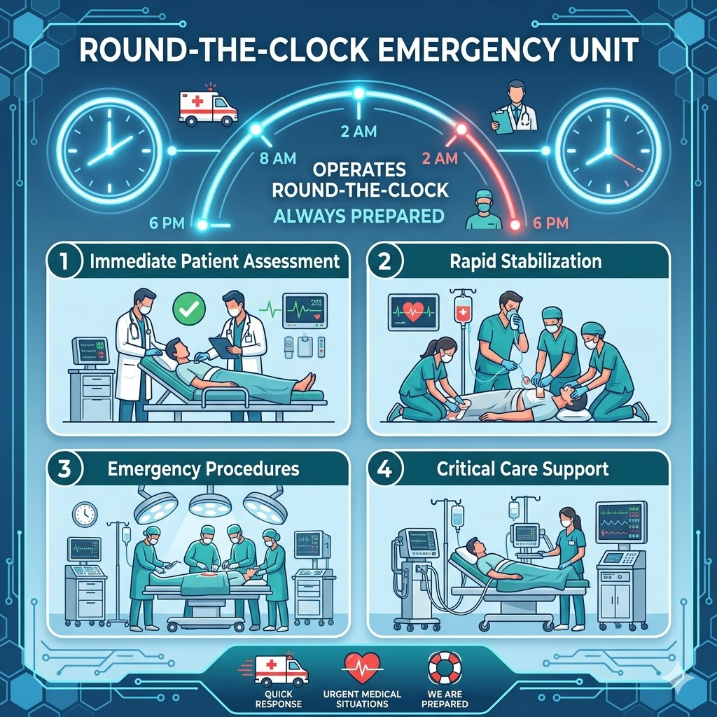Our emergency unit operates round-the-clock to handle urgent medical situations. We are always prepared to respond quickly with:
