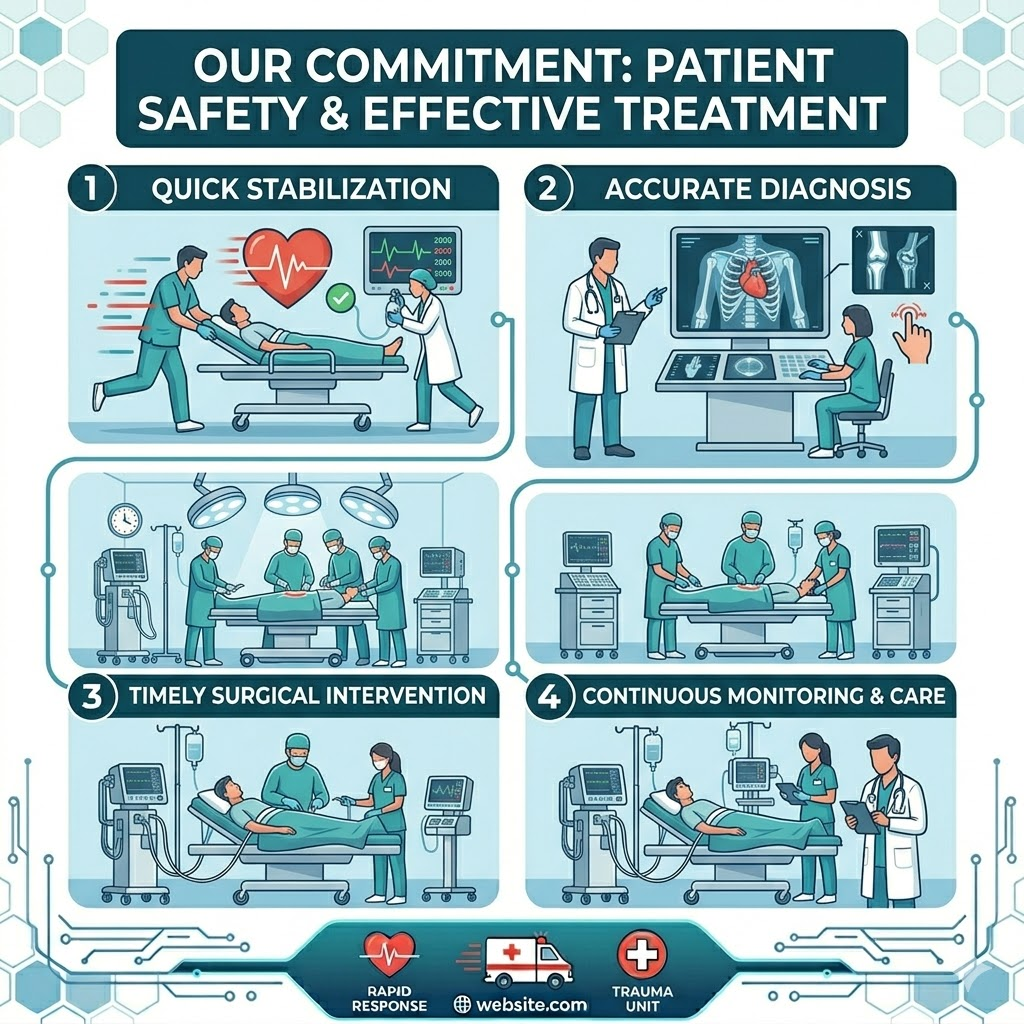 We follow strict protocols to ensure patient safety and effective treatment during emergencies. From initial care to recovery, our focus remains on:
